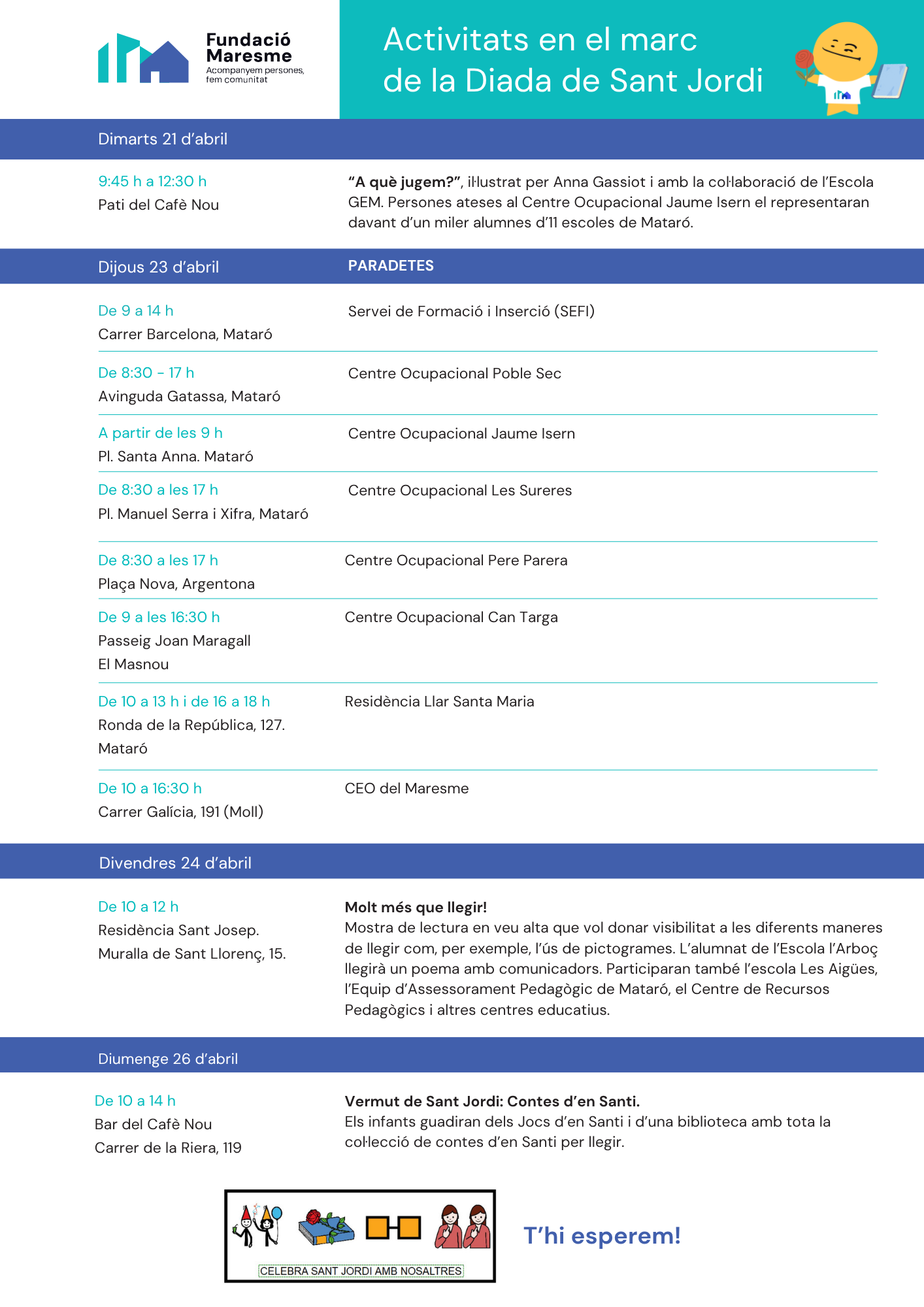 Aquesta jornada de portes obertes forma part de la celebració dels 60 anys de la Fundació Maresme, sis dècades caminant al costat de les persones, les famílies i el territori, amb el compromís de construir una societat més justa, inclusiva i humana.