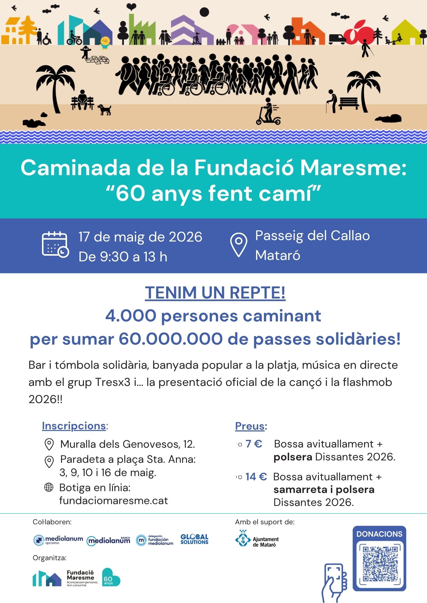 Mataró, 22 d’abril de 2026 — La Fundació Maresme impulsa la Caminada “60 anys fent camí”, una gran mobilització ciutadana que tindrà lloc el diumenge 17 de maig de 9:30 a 13 h al Passeig del Callao de Mataró, en el marc del seu 60è aniversari.