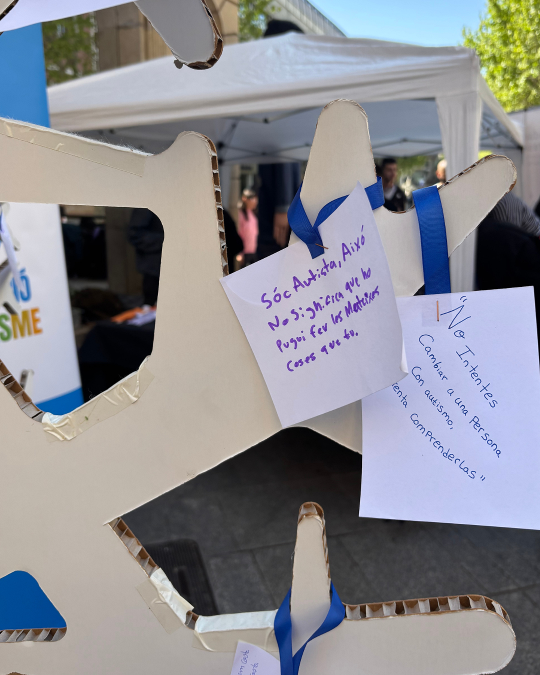 La jornada ha inclòs també diferents accions participatives obertes a la ciutadania, com la lectura d’experiències, i la creació d’un arbre de desitjos i una catifa amb sorra de colors, realitzada per la Federació Catalana de Catifaires, amb l’objectiu de generar consciència i afavorir una millor comprensió de la realitat de l’autisme.