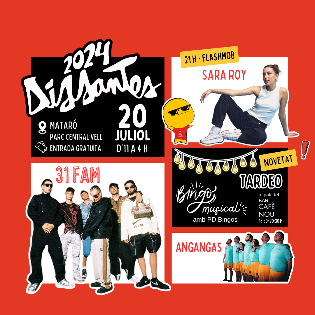 Nit de concerts amb 31 FAM com a cap de cartell. És un dels grups musicals del moment i enguany esdevenen el grup estrella d’aquestes Dissantes. 31 FAM delectaran el públic més jove amb el seu estil propi, una combinació de trap, funk, reggaeton, dancehall i R&B, amb cançons en diversos idiomes. Serà a les 00h. Abans, però, tornarà a pujar a l’escenari la manresana Sara Roy (22:30 h ) i tancarà un grup mataroní que ja és tot un clàssic de les Dissantes: Angangas (02:00 h), que versionarà èxits actuals i de sempre per fer ballar tothom fins altes hores de la matinada.